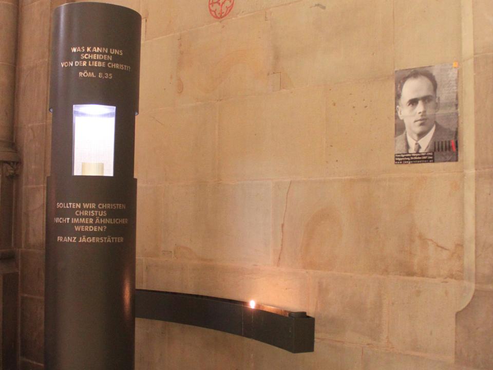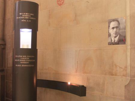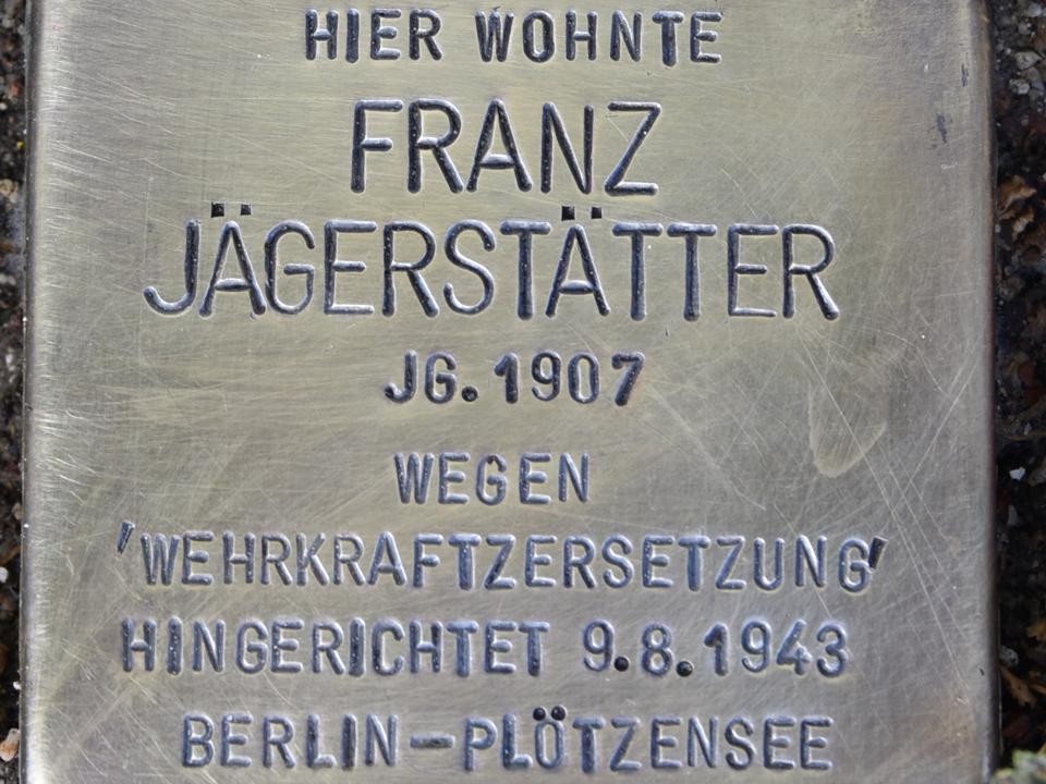 1940 wird Jägerstätter zum Militärdienst einberufen, auf Betreiben seiner Heimatgemeinde aber zweimal als unabkömmlich eingestuft. Einer weiteren Aufforderung will er nicht mehr Folge leisten und sucht, um seine Entscheidung zu bekräftigen, das Gespräch mit Priestern, die ihn von seinem Vorhaben abbringen wollen. Seine Frau Franziska hofft zwar noch auf einen Ausweg, trägt aber seinen Entschluss mit, weil es, wie sie später einmal sagte, sonst keiner getan hätte. Nach der erneuten Einberufung meldet sich Franz Jägerstätter im März 1943 bei seiner Stammkompanie in Enns, erklärt aber sofort, dass er den Wehrdienst mit der Waffe aufgrund seiner religiösen Einstellung und dem festen Willen, nicht zu töten, ablehne. Sofort wird er verhaftet und am 6. Juli 1943 vom Reichskriegsgericht in Berlin-Charlottenburg wegen «Wehrkraftzersetzung » zum Tode verurteilt. In einer seiner letzten Aufzeichnungen schreibt Jägerstätter: «Wenn ich (die Worte) auch mit gefesselten Händen schreibe, aber immer noch besser, als wenn der Wille gefesselt wäre.» Am 9. August wird das Urteil gegen ihn vollstreckt und er wird mit dem Fallbeil hingerichtet. Das Schicksal Jägerstätters bleibt lange unbekannt. Franziska Jägerstätter ist nach dem Krieg Anfeindungen und Benachteiligungen ausgesetzt, auch eine Witwenpension wird ihr verwehrt. Erst in den 1990er- Jahren setzt ein Umdenken ein, 1997 hebt das Landesgericht Berlin das Urteil gegen Jägerstätter auf und die katholische Kirche eröffnet ein Seligsprechungs-Verfahren. 2007 wird er im Mariendom in Linz selig - gesprochen, in Anwesenheit seiner Witwe und seiner vier Töchter.