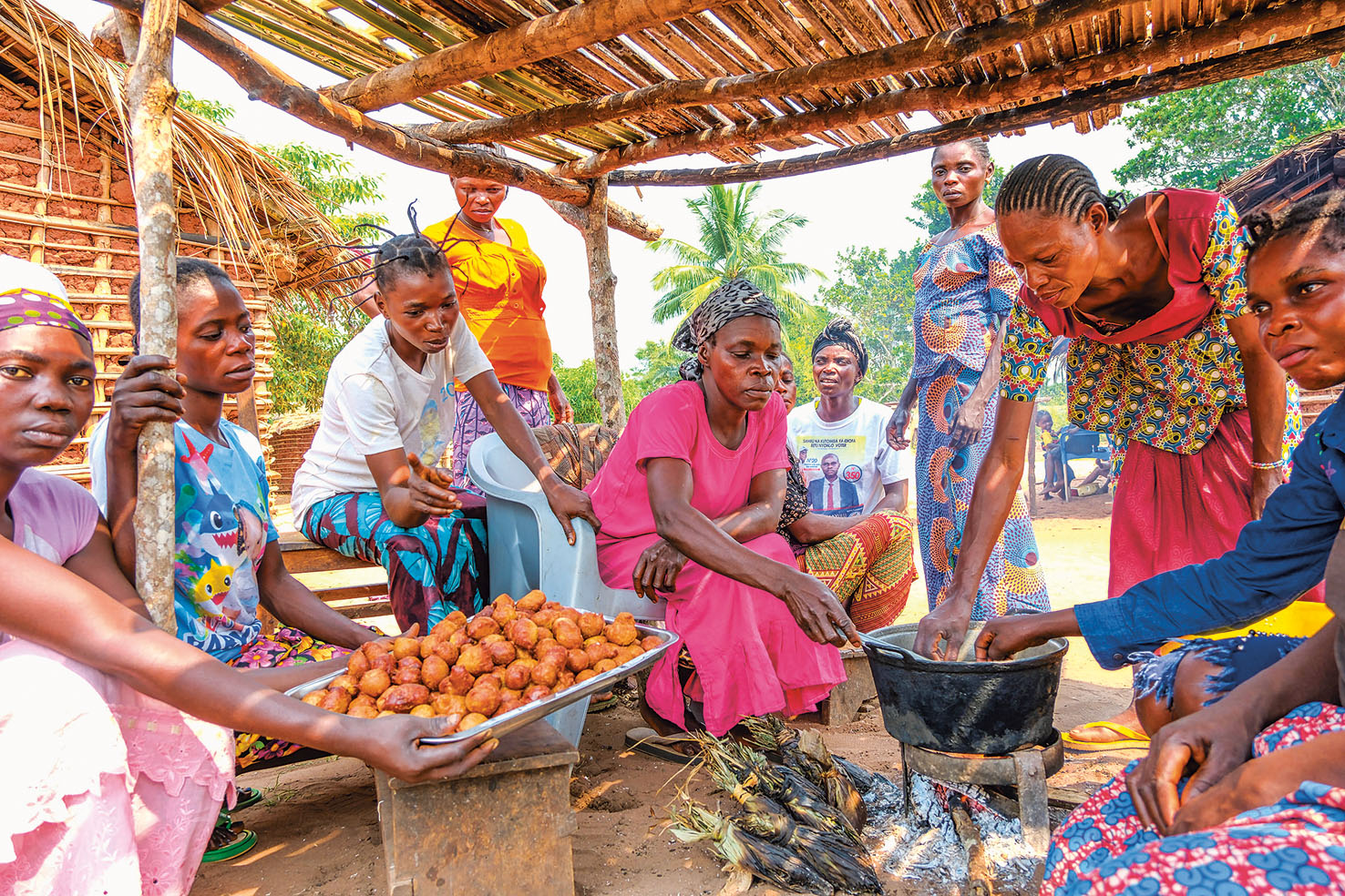 Nsel Itungu ist die Präsidentin einer Solidaritätsgruppe, die unterschiedliche Gemüsearten auf Feldern in der Nähe eines Flusses anbaut. « Dank unserer harten Arbeit leiden wir heute nicht mehr unter Hunger. Unsere Felder liefern eine Fülle an Gemüse. So können wir uns und unsere Kinder das ganze Jahr durch ausreichend und abwechslungsreich ernähren. » Durch die Schulungen von CDRM mache ihr Dorf Mputanzu grosse Fortschritte. Davon profitieren auch Nsels achtjährige Tochter Dina und ihre drei Geschwister. « Wir essen jeden Tag drei Mal, unter anderem Maniokblätter, Avocados, Sauerampfer, Reis, aber auch Fisch oder Fleisch », erzählt Dina. « Und wenn ich zwischendurch mal Hunger habe, bereitet mir Mama etwas zu, gerade eben hat sie mir Krapfen und Bananen gebracht. » Die gesicherte Ernährungssituation ermöglicht es ihr, sich auf anderes zu konzentrieren. Sie geht zum Beispiel gerne zur Schule – so gerne, dass sie davon träumt, später selbst einmal Kinder zu unterrichten.