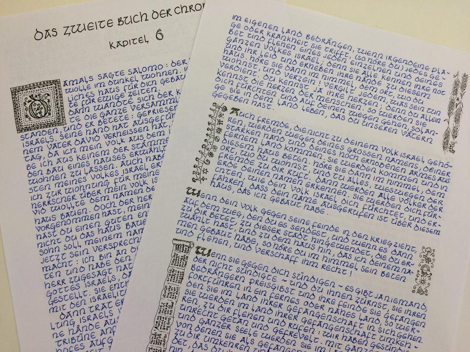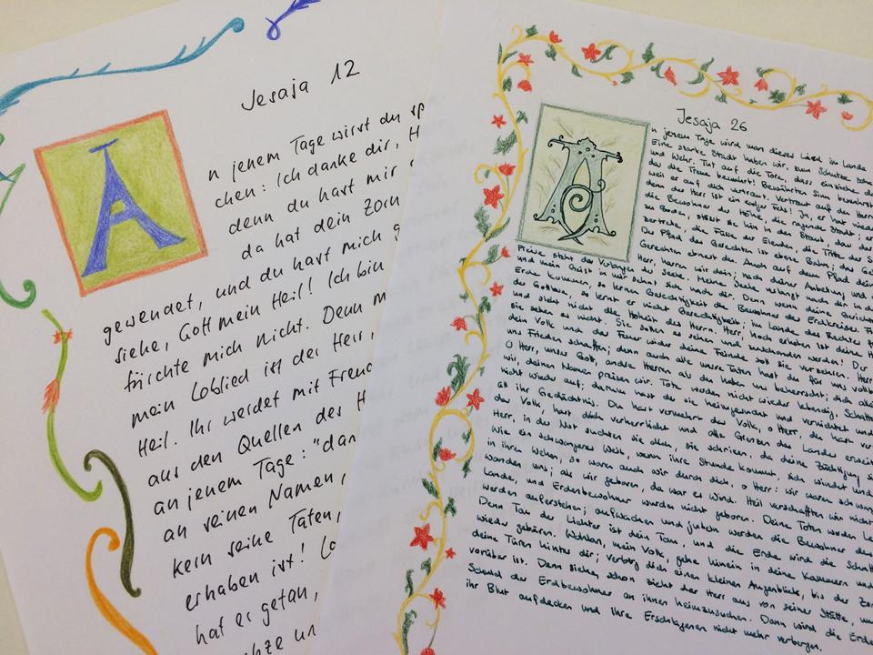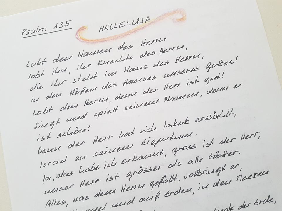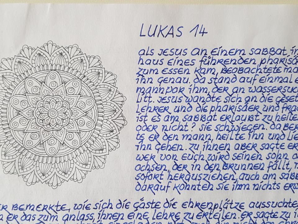 Täglich kommen zwischen 20 und 30 A4- Couverts bei der Cityseelsorge in St. Gallen an. «Das Öffnen der Couverts ist etwas vom Schönsten», schwärmt Roman Rieger, Leiter der Cityseelsorge und Mitinitiator des aussergewöhnlichen Projekts. Denn was die freiwilligen Helfer*innen, die fleissig fürs Einsortieren und Erfassen eingesetzt werden, Überraschendes zu Gesicht bekommen, könnte unterschiedlicher nicht sein: Bibeltexte, von schlicht mit Kuli geschrieben, bis hin zu kalligraphischen Meisterleistungen. Nicht selten ist die Seite bemalt oder der Anfangsbuchstabe des Textes verziert. Die Texte sind nicht nur in Deutsch geschrieben, sondern kommen auch in Dialekt, Aramäisch, Englisch oder Französisch daher. «Das Volk Gottes schreibt ab», sagt Rieger dazu. Es ist ein Beweis dafür, dass das Projekt, das noch bis Pfingsten dauert, weit über die Kantons- und Landesgrenze hinaus bekannt geworden ist.