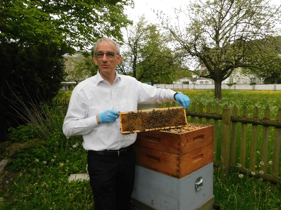 Lukas Weinhold hat mehrere Bienenstöcke im Garten des Pfarreihauses.