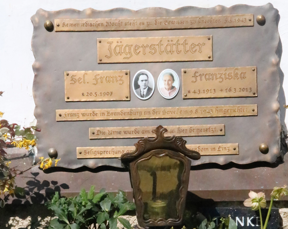 1940 wird Jägerstätter zum Militärdienst einberufen, auf Betreiben seiner Heimatgemeinde aber zweimal als unabkömmlich eingestuft. Einer weiteren Aufforderung will er nicht mehr Folge leisten und sucht, um seine Entscheidung zu bekräftigen, das Gespräch mit Priestern, die ihn von seinem Vorhaben abbringen wollen. Seine Frau Franziska hofft zwar noch auf einen Ausweg, trägt aber seinen Entschluss mit, weil es, wie sie später einmal sagte, sonst keiner getan hätte. Nach der erneuten Einberufung meldet sich Franz Jägerstätter im März 1943 bei seiner Stammkompanie in Enns, erklärt aber sofort, dass er den Wehrdienst mit der Waffe aufgrund seiner religiösen Einstellung und dem festen Willen, nicht zu töten, ablehne. Sofort wird er verhaftet und am 6. Juli 1943 vom Reichskriegsgericht in Berlin-Charlottenburg wegen «Wehrkraftzersetzung » zum Tode verurteilt. In einer seiner letzten Aufzeichnungen schreibt Jägerstätter: «Wenn ich (die Worte) auch mit gefesselten Händen schreibe, aber immer noch besser, als wenn der Wille gefesselt wäre.» Am 9. August wird das Urteil gegen ihn vollstreckt und er wird mit dem Fallbeil hingerichtet. Das Schicksal Jägerstätters bleibt lange unbekannt. Franziska Jägerstätter ist nach dem Krieg Anfeindungen und Benachteiligungen ausgesetzt, auch eine Witwenpension wird ihr verwehrt. Erst in den 1990er- Jahren setzt ein Umdenken ein, 1997 hebt das Landesgericht Berlin das Urteil gegen Jägerstätter auf und die katholische Kirche eröffnet ein Seligsprechungs-Verfahren. 2007 wird er im Mariendom in Linz selig - gesprochen, in Anwesenheit seiner Witwe und seiner vier Töchter.